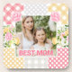 This charming “Best Mom” design features a warm mother‑and‑child photo framed by a soft floral plaid collage. The patchwork border blends gingham, polka dots, stripes, and pastel pattern blocks in pink, yellow, and grey, accented with illustrated roses, tulips, and delicate white florals. The mix of textures creates a handcrafted, uplifting feel with a gentle, heartfelt mood. Perfect for Mother’s Day, birthdays, or celebrating a truly special mum, this design pairs sentiment with fresh, modern cottage‑inspired style.