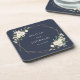 Añada un toque personal a la celebración de su boda con estos artículos fiestas elegantes y memorables. El diseño está decorado con flores de acuarela blanca, vegetación y marco dorado sobre un fondo azul marino.