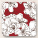 Dibujo de líneas adornadas con flores de manzana blanca sobre un fondo rojo oscuro.