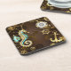 Fondo de madera marrón con mar, cresta mecánica, volante antiguo, ancla dorada y varios engranajes de oro y latón. Estilo Steampunk.