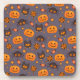 Patrón de halloween super lindo. En este ilustracion se pueden ver calabazas, arañas, búhos, estrellas y dulces. El diseño del patrón está en el fondo de un punto de polka morado.