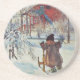 Una pintura del siglo XIX de una niña esquiando hacia una casa de campo roja con su padre en el fondo. Fina de arte del pintor sueco Carl Larsson.