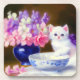 ¡Atracciones con un hermoso gatito blanco usando una cinta morada! Este florido gatito se encuentra junto a un bol azul y un jarrón de flores rosas, violetas y blancas. Un regalo maravilloso para los amantes del gato y del arte victoriano.