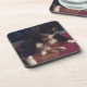 Las suaves patas de gatito son lo primero que se ve en la fotografía original de ZoeSPEAK de un gato calico, en este Coaster. El gato mayormente negro y marrón está acostado sobre una manta oscura roja y marrón contra un fondo oscuro, y sus patas blancas resaltan, extendidas frente a ella con las dos centrales cruzadas entre sí. El pelaje blanco en su pecho sube hacia su cara, con sus ojos fijos en algo al otro lado de la habitación.