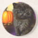 ¡Posavasos de arenisca con un gatito vintage de Halloween! Un gatito negro esponjoso posa junto a las calabazas contra un fondo púrpura. ¡Un regalo divertido para fiestas de Halloween y amantes de los gatos!