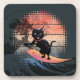 Pascua de gatos de Wave-Riding al atardecer: un gato negro surfeando sobre una ola, con el sol en tonos rosados y naranjas, creando una escena caprichosa y surrealista.