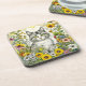 Arte estilo arte folclórico ai que representa a un lindo gato gris y blanco sentado en flores amarillas y blancas.