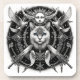 La imagen es un ilustracion detallado y místico centrado alrededor de la cara de un gato con ojos azules llamativos. La cara del gato está rodeada de elementos intrincados y simbólicos, dándole un aura de poder y sabiduría. Encima de la cabeza del gato hay un sol radiante con una cara humana que añade una cualidad celeste y divina a la escena. A ambos lados del gato hay dos palomas huyendo, que representan paz y pureza. Toda la composición está enmarcada por elementos circulares, mecánicos y celestes, como engranajes, cadenas y estrellas, que evocan una sensación de equilibrio y misterio cósmico. Dos espadas ornamentadas cruzan bajo la cara del gato, simbolizando protección y fuerza. Estas espadas están adornadas con elementos decorativos y se complementan con alas, lo que realza aún más la temática mística de la imagen. El estilo general de la imagen es monocromático, con detalles finos y una mezcla de patrones orgánicos y geométricos que crean un sentido de armonía y poder. La combinación de estos elementos sugiere temas como la tutela, la perspicacia espiritual y el orden cósmico, en los que el gato es una figura central, casi divina, en este intrincado tableau de otro mundo.