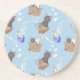 Gatos en tazas y cajas y gotas de leche en el fondo azul