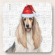Un juego de montaña rusa para la persona que ama a su perro afgano. Esta se viste con un sombrero Santa para Navidades para un acercamiento elegante a la temporada navideña, y se sienta con tacto contra un descolorido fondo WOOF para decorar su casa u oficina con alegría de amante de las mascotas de temporada.