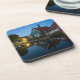 Fotostadora de plástico con una casa tradicional de madera usada como una granja de quesos con pintura verde con tejas rojas y reflejo en el agua al inicio de la noche al crepúsculo en el museo Zaanse Schans en Holanda.