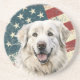 On this sandstone coaster, a watercolor portrait of a beautiful white Great Pyrenees Dog is placed against a grunge background of the USA flag. Perfect for any patriot who loves a Pyrenees!