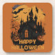 Das Bild zeigt ein imposantes, gotisches Schloss, erleuchtet von einem warmen, orangefarbenen Mondschein, der eine unheimliche Stimmung erzeugt. Umgeben von fliegenden Fledermäusen, kahlen Bäumen und geschnitzten Kürbissen strahlt es eine Mischung aus Mystik und festlicher Vorfreude aus. Die dunkle Silhouette des Schlosses mit seinen spitzen Türmen dominiert die Szene, während „HAPPY HALLOWEEN“ in leuchtenden Buchstaben eine fröhliche Botschaft inmitten der düsteren Atmosphäre vermittelt.