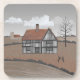 Colourful artwork of an old medieval house in the English countryside, with an old church in the background, and a couple of hares boxing in the foreground. Perfect for anyone who loves folk art.