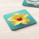 Un alegre hibisco amarillo que simboliza la luz del sol y la felicidad, situado sobre un fondo turquesa. Los pétalos se enrollan suavemente hacia el exterior, resaltando su encanto tropical.