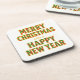 Fun festive coasters with "Merry Christmas and a Happy New Year "on it. Lettering in a cheery red and green geometric pattern outlined in gold. Makes a great hostess gift with holiday wine when getting together with family or friends.