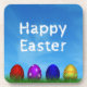 Feliz ilustracion de Pascua con coloridos huevos de Pascua pintados en el césped con el cielo azul en la parte trasera y la tipografía de "Feliz Pascua" escrita con nubes blancas.