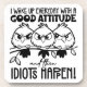A humorous and sarcastic black-and-white graphic design showcases three bird silhouettes perched on a branch, each with big, expressive eyes. The black handwritten text reads, "I wake up every day with a good attitude and then idiots happen." This design is available on a variety of products, making it a perfect gift for bird lovers and fans of sarcastic humor.