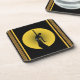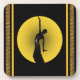 Conjunto de 6 galeras de plástico de respaldo alto y brillante con una imagen de una silueta femenina de estilo Art Déco, colocada en la luz amarillo brillante de una luna llena. Llave griega dorada y detalles de cinta amarilla.