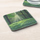 La luz del sol se filtra a través de árboles altos y densos, lo que arroja un resplandor radiante sobre un frondoso y verde suelo forestal salpicado de delicadas flores blancas. El entorno sereno evoca una sensación de paz y tranquilidad.