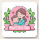 Hermoso posavasos ideal para el Día de la Madre. Una adorable ilustración de una madre y su hijo dándose un cariñoso abrazo. Ambos llevan una camisa azul y tienen cabello castaño. Ambos tienen una sonrisa cariñosa y mejillas sonrosadas. Están dentro de un círculo rosa con destellos y dos corazones de amor alrededor. Debajo de ellos hay una pancarta rosa con una elegante escritura que dice 'La mejor mamá del mundo', este es un modelo que se puede utilizar tal cual o reemplazar el texto original con el propio para personalizar. Alrededor del círculo y la pancarta hay hojas verdes y flores rosas. Un bonito dibujo ideal para tu mamá.