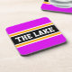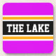 Este diseño deportivo y colorido presenta el atlético texto "EL LAGO" dentro de una franja negra ancha realzada con pinstripes blancas y amarillas contra rayas exteriores de color rosa brillante. El texto y los colores de este diseño se pueden personalizar.
