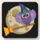 Personalizado búho mago volando en una escoba mágica en una noche de luna llena. El búho violeta lleva puesto un gorra mago y grandes anteojos rojos redondos y lanza un hechizo con una varita mágica. Perfecto para Halloween o magos, brujas y amantes de la magia.