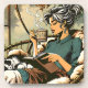 Una dama de bonito relajándose en su acogedora silla Papasan leyendo un libro, tomando café con un lindo gato negro y blanco durmiendo en su regazo.