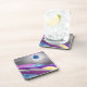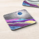 Un hermoso diseño paisajístico abstracto con una luna azul y coloridas colinas onduladas en tonos violeta, azul, cian y amarillo.