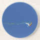 Fotografía de una cometa de pájaro de macao colorida con cintas flotando en el viento que salen de sus alas, volando alto en el cielo azul de verano. Fotografía Copyright ©Kimberly J Tilley.