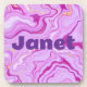 Esta es una montaña rusa de nombre de mármol. El diseño de la montaña rusa fue creado con inteligencia artificial. El arte está decorado con un diseño rosa, lavanda, violeta, azul, dorado y blanco de remolinos de mármol. Las galletitas son tiras de plástico duras con respaldo de corcho. El nombre Janet está en la montaña rusa. Puede reemplazar el nombre por el botón Personalizar.