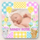 Este diseño de anuncio de bebé dulce presenta una foto pacífica de un recién nacido enmarcada por un suave collage floral a cuadros en tonos pastel. El borde de patchwork combina gingham, lunares y bloques de patrones delicados en rosa, azul, amarillo y morado, acentuados con encantadoras flores ilustradas y adorables motivos de personajes. La mezcla de texturas crea un ambiente suave y artesanal con un estado de ánimo cálido y caprichoso. Perfecto para anuncios de nacimiento, decoración de guardería o regalos para guardar recuerdos, este diseño combina colores suaves, detalles juguetones y encanto sincero.