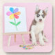Un dulce cachorro casero que parece que acaba de pintar una flor de color arcoiris, sobre un fondo rosa.