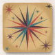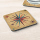 Esta montaña rusa presenta un diseño moderno de diseño morado, azul y rojo con estreno de mediados de siglo. El arte cuenta con un rosa de brújula de estilo retro. La estrella central tiene 14 rayos puntiagudos en un patrón simétrico. El fondo es de color dorado. Esta montaña es una montaña de plástico cuadrado duro con respaldo de corcho. Hay seis tiras en el set. El diseño tiene una estética moderna vintage de mediados de siglo.