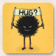 Una montaña rusa enorme con un monstruo malvado lindo - un personaje peludo sonriente de la familia del Malvado Flor Bug. Lleva un cartel con el mundo escrito a mano "¿Abrazo?". Esta criatura rara amigable tiene calcetines lindos y sin mangas solamente para mantener sus pies calientes en este mundo poco amistoso.