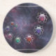 Un ilustracion de infinito, cruzando el universo para combinar el microscópico y el telescópico en una muestra de formas y colores arcoiris. Columna de átomos multicolores de azul, rosa, rojo y verde rodeados de anillos de plata que atraviesan el espacio exterior en espiral contra un fondo de galaxias fractales coloridas.