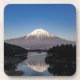 Majestic Mt Fuji reflected in Lake Tanuki and framed by the river banks at nightfall.