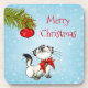 Un juego de montaña cutre y divertido con el tema de los navidades. Un gatito blanco siamés travieso y divertido. Está mirando hacia arriba una decoración de un árbol de navidad colgando de una rama de pino preguntándose si debería ser traviesa y jugar con ella o no. El texto dice Feliz Navidad con una tipografía caprichosa. Está situado sobre un fondo azul con copos de nieve blancos.