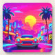 Cruzar a través de una vibrante ciudad de neón al atardecer. Un coche clásico navega por el deslumbrante paisaje urbano, bañado en tonos cálidos. Ideal para los amantes del arte retro-futurista y urbano (Este diseño hecho con IA). ¡Haga el pedido hoy y acepte la alegría de ir de compras!