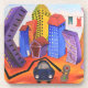 Una pintura colorida, divertida e imaginativa que representa a alguien en un auto saliendo de un pueblo con edificios doblados.