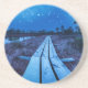 Vista panorámica de la ciudad de bog por la noche con sendero de madera, pequeños estanques y pinos. Camino de senderismo con pasarela de madera que atraviesa el pantano contra luna llena y cielo nocturno con estrellas.