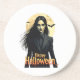 Estilizado ilustracion de una misteriosa bruja de pie bajo una brillante luna llena, con murciélagos volando por ahí y un espeluznante mensaje de 'Feliz Halloween'.