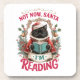 A fun and cheerful Christmas holiday design showcases a black cat dressed in a red cape and a white turtleneck sweater, engrossed in reading a book. The cat sits in front of fern and holly branches, under a golden arch adorned with bells. The colorful text reads, "Not now Santa, I'm reading." This design is available on various products that make perfect gifts for book lovers.