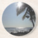 La luz del sol se ilumina a través de una palmera en una playa tropical con un océano a lo lejos iluminado por el sol. Espectaculares vibraciones tropicales.