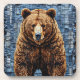 Arte vibrante que representa un oso con un rico abrigo de piel texturizado, colocado sobre un fondo de parches con tonos azules y grises. El oso se mantiene imponente y realista, captando la atención con sus características realistas.