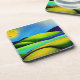 Diseño de paisaje acuático digital en tonos vivos de azul, verde y amarillo con un sol y pájaros.
