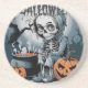 Escena espeluznante de Halloween con un esqueleto dentro de una calabaza, rodeada de elementos inquietantes.