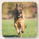 Un perro pastor alemán recubierto de rojo corre felizmente al aire libre.