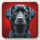 Ilustración llamativa de un perro labrador negro, representado de manera audaz y estilizada. El perro tiene una cara prominente y expresiva con ojos naranja brillantes que transmiten una sensación de intensidad. El fondo es un rojo vibrante que contrasta marcadamente con el lustroso pelaje negro del perro, que se detalla con una variedad de tonos que resaltan su textura. La composición general le da a la pieza una presencia dinámica y poderosa, enfatizando las características del perro y creando un impacto visual atractivo.