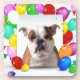 Una linda foto de un perro Bulldog con globos de colores en el fondo. Un diseño perfecto para fiestas y celebraciones de cumpleaños.